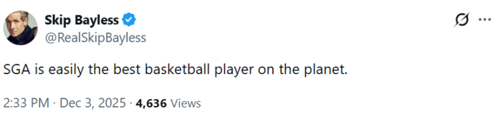 赛后,美国知名体育评论员SkipBayless更推,称赞了雷霆后卫谢伊-吉尔杰斯-亚历山大的发挥: