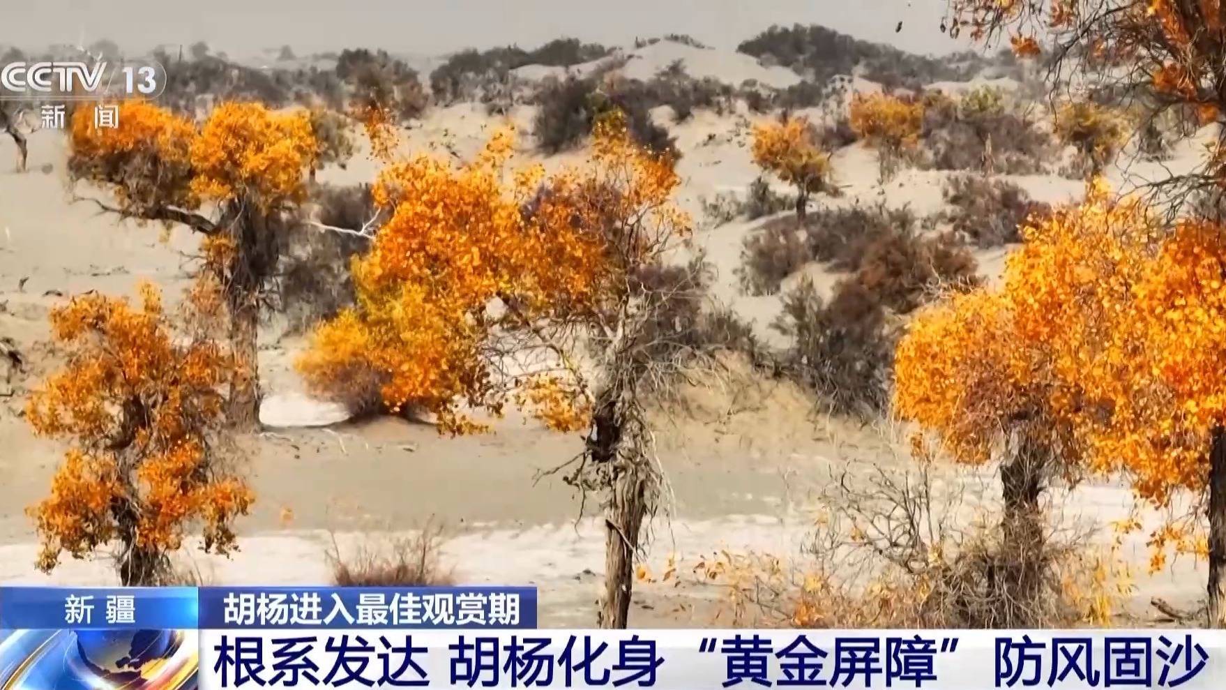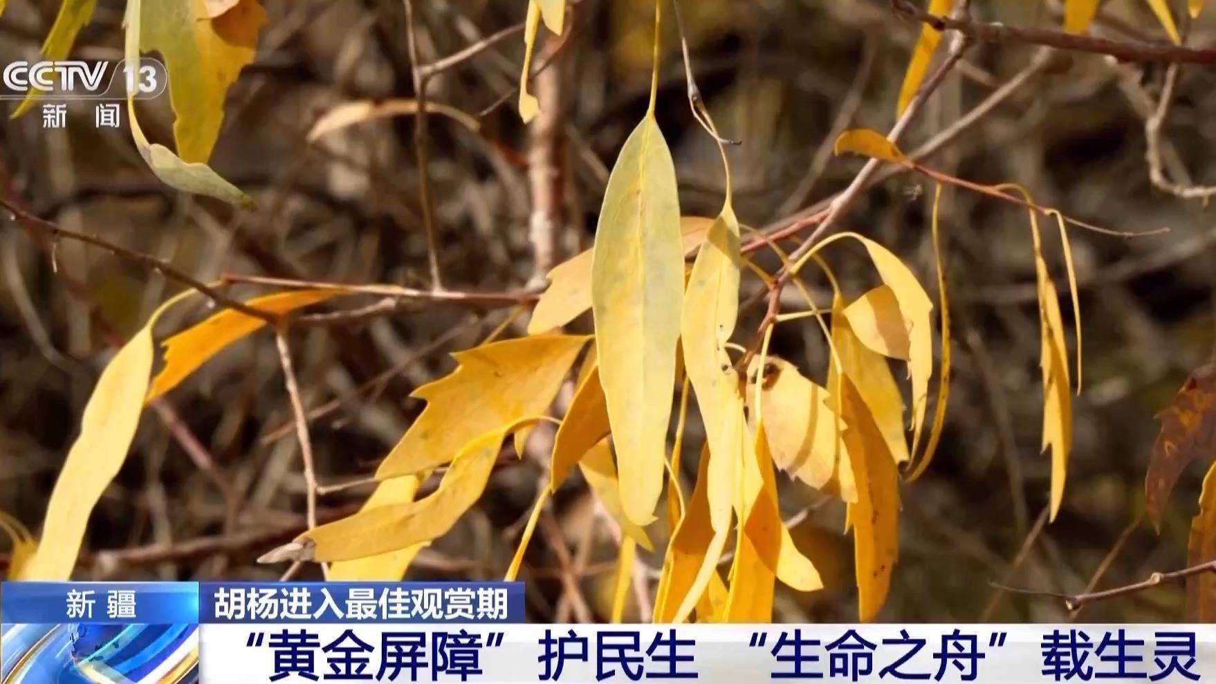 rr总台记者 周宇:新疆沙雅县拥有着全世界面积最大的野生胡杨林。这里的胡杨林进入了最佳的观赏时期。当我们走近胡杨,会发现同一棵树上拥有着不同形状的叶子: