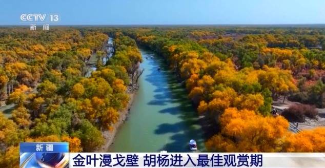 r在塔里木河流域,近1700万亩天然胡杨换上了耀眼的“盛装”,斑斓的胡杨林与天山南北的沙漠、戈壁、碧水相互映衬,仿佛是一幅流动的油画。在沙海中,一汪碧水已是奇迹,水中挺立的胡杨林,更成了这方天地独有的景致。游客乘船而行,仿佛走进金色的“水上森林”。